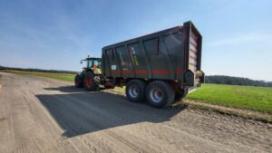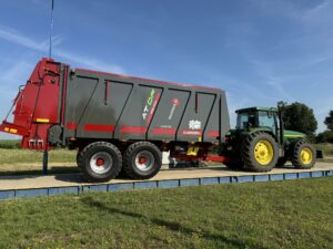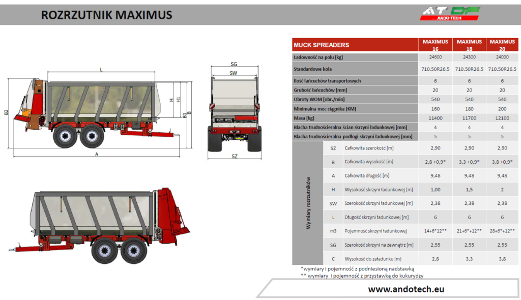 Potężny rozrzutnik dwuosiowy „MAXIMUS” to (jak mówią Nasi klienci) pancerna konstrukcja. Skrzynia w całości wykonana z blachy o grubości 6mm. Dodatkowo cała wykonana jest z blachy typu HARDOX, czyli blachy dużo odporniejszej na ścieranie niż zwykła. Maximus to przede wszystkim duża ładowność (18-22 m3) oraz wszechstronność. Rozrzutnik „MAXIMUS” swoją pojemnością zaspokoi potrzeby nawet największych gospodarstw. Mimo iż jest to nasz nowy produkt to już dostajemy informacje zwrotne, że jego zastosowanie wybiega daleko poza rozrzucanie obornika. Świetnie sprawdza się przy rozsypywaniu wapna, przy transporcie mas zielonych z pola na pryzmę czy przy usypywaniu pryzm z kukurydzy. Dzięki zastosowanemu systemowi dwóch potrójnych łańcuchów posuw i rozładunek jest płynny i nie obciąża w sposób znaczny traktora. Wysuwane burty boczne znacznie zwiększają ładowność rozrzutnika. Rozrzutnik „MAXIMUS” posiada homologację drogową na terenie Unii Europejskiej „EU”! Maszyna może służyć w gospodarstwie jako przyczepa (do przewożenia kiszonki z pola), jako rozrzutnik obornika (3 poziome wały rozrzucające), a także jako rozsiewacz wapna czy nawozu (dodatkowe, masywne talerze rozrzucające). Na długą i niezawodną pracę udzielana jest 5-letnia gwarancja.